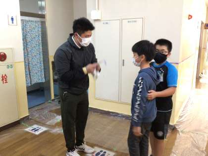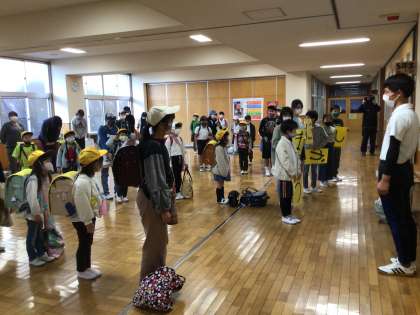 一斉下校では、代表の学生さんに全校からお礼を伝えました。子供たちの下校後も急ピッチで階段の塗装を行い、新品同様に刷毛やローラーを洗ってくれました。挨拶の後、バスの待つ交流館まで歩いて帰っていきました。