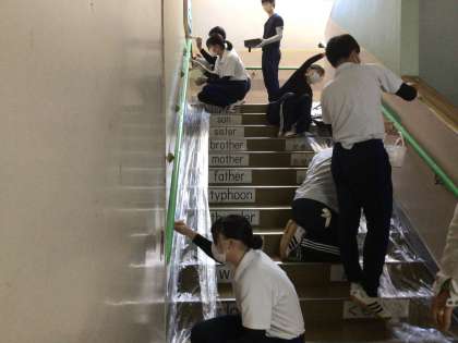 早朝より一生懸命の美しさを見せていただいた、トヨタ工業学園の皆さん、ありがとうございました。コーディネーターの酒井さん、鈴木さん、ありがとうございました。150周年に向けて学校がとても明るくなりました。明日の授業参観では、ぜひぴかぴかになった壁をご覧ください。なお、ペンキぬりたてのため、歩行にはくれぐれもご注意ください。