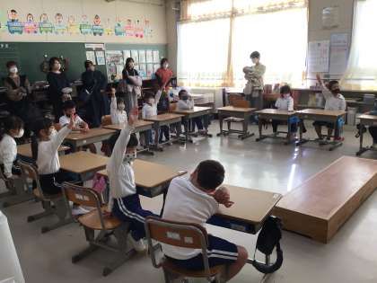 1年生は、「橋の上のオオカミ」を通して、親切・思いやりについて話し合いました。意地悪をしたときと親切にしたときの気持ちを比較しながら親切にすることの喜びやよさについて考える学習でした。子供たちは役割演技をしながら次は自分が言いたくてたまらないといった様子でした。