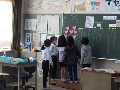 授業の最後には、これまで親切にしたことをハートカードに書き、黒板のぐみの木に貼ることができて、みんな満足そうでした。どんどんハートカードが増えるといいですね。