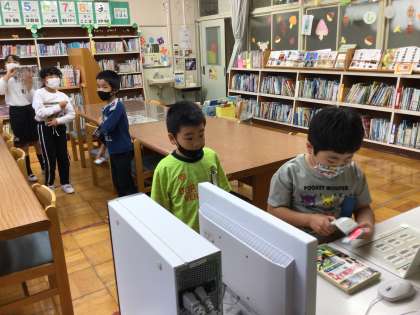 雨が降っていたので、今日は図書館に1、2年生の子たちがたくさん来てくれました。本好きの3、4、5年生も遠くから本をかかえて、よく来ています。もう200冊になりますという子もいました。細かい文字を読む低学年の子もいて、感心します。幸海小学校は本好きの子を育てる取り組みをしています。