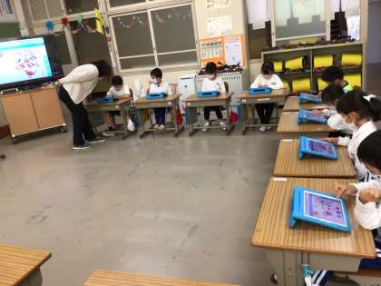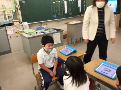 考えを整理するために、学習タブレットの発表ノートにハートマークを貼り付けて、理由を伝えます。ハートマークは、赤色が優しい、青色が悲しいなのですが、半分赤、半分青のハートマークもあり、その理由についても、みんなで話し合います。