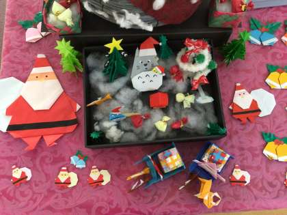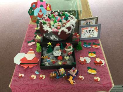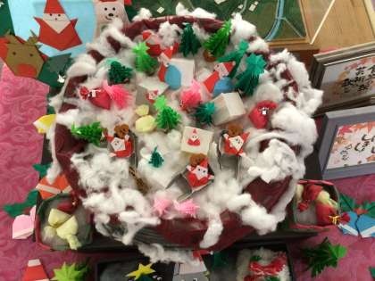 公務手の方が毎月、玄関に季節に応じた折り紙で作る飾りを置いてくださっています。12月は、サンタクロースのクリスマスの様子です。素敵ですね。