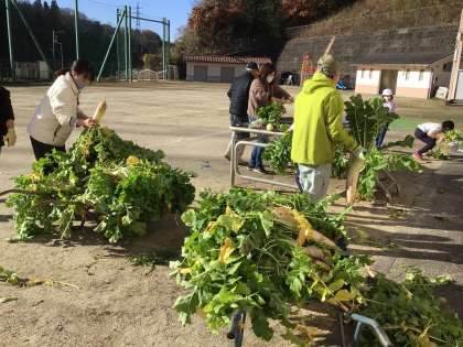 豊作の大根の泥を1本1本丁寧に洗う子供たち。冷たい水ですが、頑張りました。