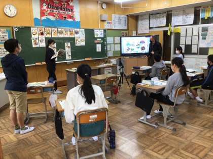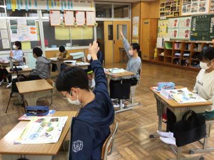 リスニングの後、思い出を伝える会話練習をしました。ブライアン先生と担任の先生が、オールイングリッシュで、ジェスチャーを交えながら、水泳のリレーを説明すると、モグラの競争?という珍回答が出て、大笑いでした。