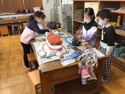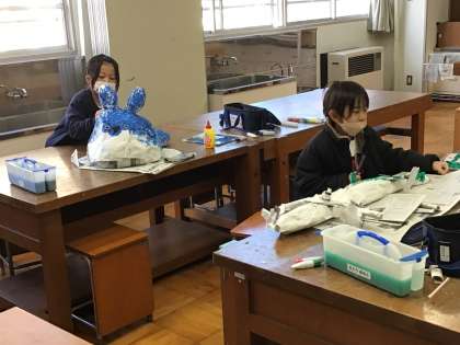 2年生は図工室で新聞紙を使って作品作りをしていました。ずいぶん愛着をもって作成しています。出来上がりが楽しみですね。