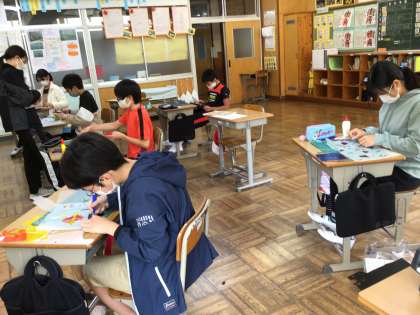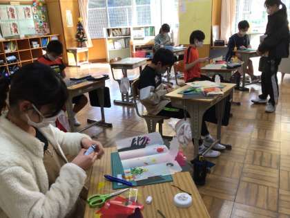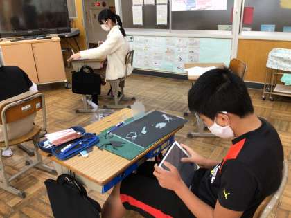 6年生はステンドグラスの作品がずいぶん出来上がってきました。どの子も明かりを灯した時にきれいに輝く場面を選び、根気よく製作しています。思い思いの作品が出来上がりそうです。深海魚の世界を選んだ子はタブレットで検索し、シルエットを確かめていました。便利ですね。