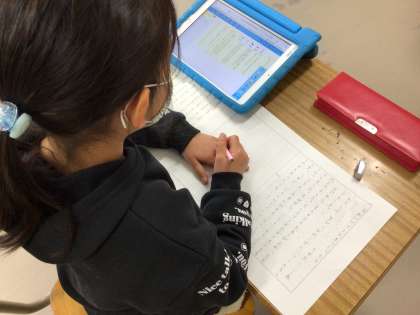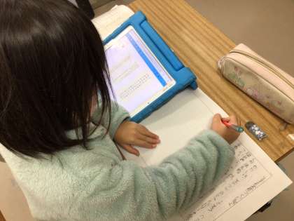 1年生の教室では、今年の締めくくりをしていました。作文の清書、漢字ドリル、お道具箱の片づけなど、順番に取り組んでいました。先生から合格をもらうと、やったあ!という声が聞かれました。
