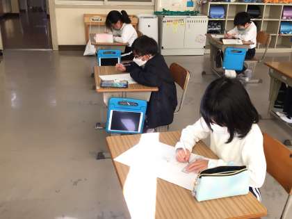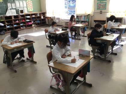 2年生の教室では、算数のチャレンジテストの最中でした。先生が子供たちのために作成したテストです。私も静かにそうっと写真を撮りました。頑張れ!