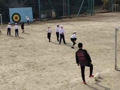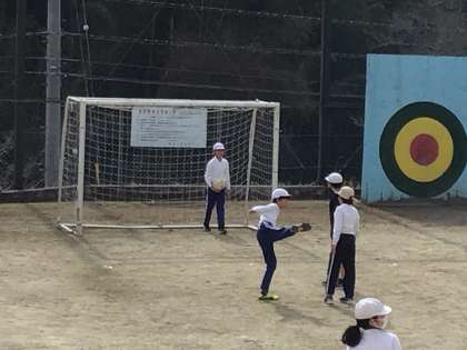 5年生は体育でサッカーをしました。左足をうまく使ってるね!とほめられた子をお手本にして、どんどんうまくなっていく子供たち。おもしろいように、連続ゴールを決めました。