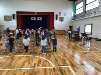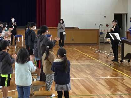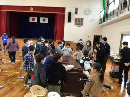 アウトリーチで打楽器演奏の方がみえました。打楽器の説明を聞いたり、一緒にボディパーカッションを使って、演奏しました。