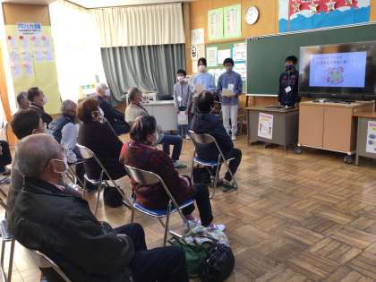 子供たちは「ふるさとをどんな町にしていきたいのか」プレゼンをした後、体操や脳トレなど思い思いのアイデアで交流を楽しみました。