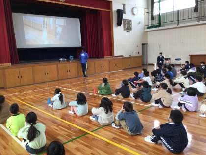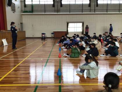 体育館では校務主任の先生から避難の様子を映した動画を見ながら説明がありました。子供たちの避難がとても速やかに静かにできたことについて署員の方から褒めていただきました。