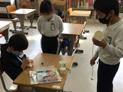 自分が作ったけん玉をお手本にして説明する子もいました。