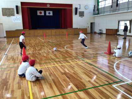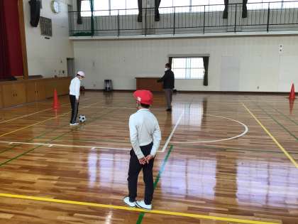 体育館でサッカーのパスの練習をしました。