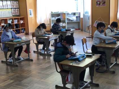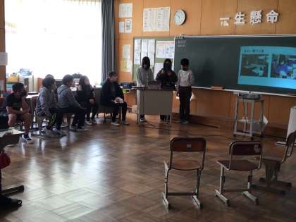 3年生はタブレットを使って復習、4年生は理科の実験、5年生はプレゼンの練習中でした。