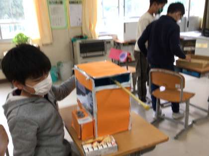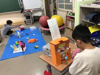 すべて、むくのきの6年生が作成した手作りおもちゃです。空き箱をなど身近な物で作成した逸品ばかりです。工夫がいくつもあるので、みんなからも口々にすごいねという言葉が聞かれました。明日招待されるのは5年生の女の子たちかな。
