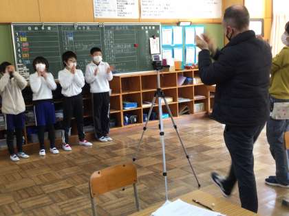 外国語活動の振り返りを記入した後、何やら不思議な動きをする子供たち。ブライアン先生とどんな話をしているのでしょう?たくさん拍手もしましたね。