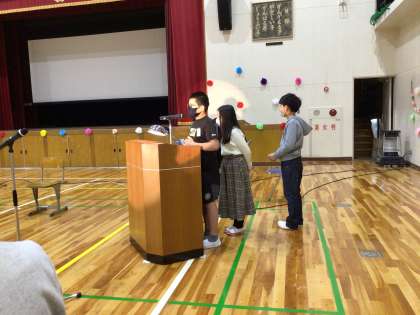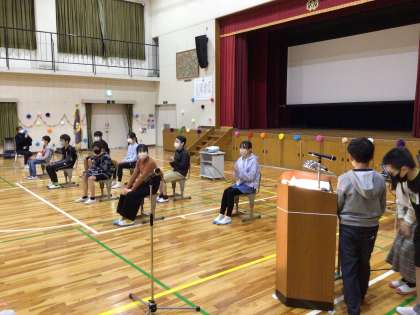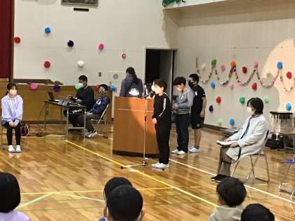 5年生の司会で卒業生を送る会が始まりました。卒業生8名の入場です。
