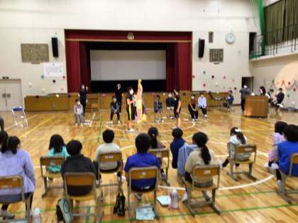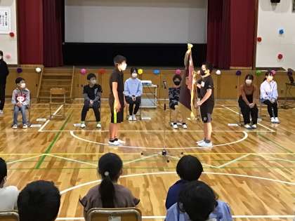 校旗伝承。6年生から5年生へ校旗が引き継がれました。