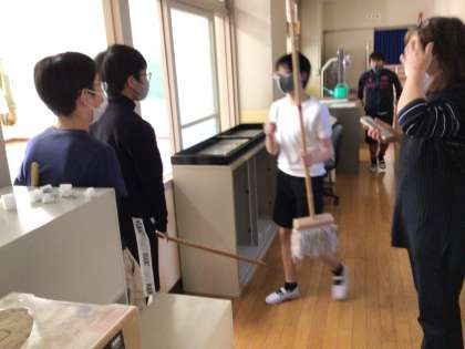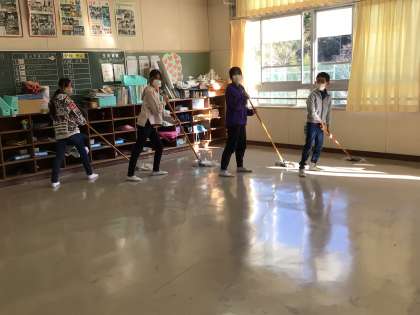 今週、6年生は図工室図書館に引き続き、12年生の教室のワックスがけをしてくれました。愛校活動の一環です。今日は体育館も掃除してくれました。ワックスが乾く間に3年生で担任してもらった一年生の先生と昔話を楽しみました。みんな大きくなったね。