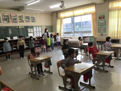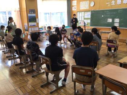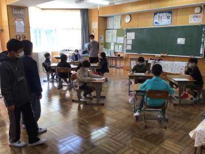 5年生の教室では、もしカギをなくして家に入れなかったらどうする?というテーマで話し合いがありました。グループ対話の後、6年生が「5分間次々と話し続けられたのがすごいですね、」「お互いのよいところを認め合えるとよいですね。」と評価してくれました。確実に授業の土台となる伝える力、聴く力が育っています。