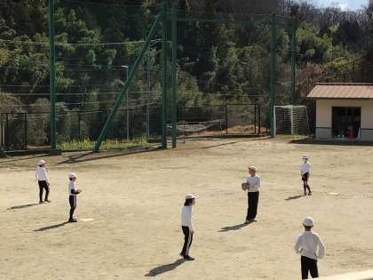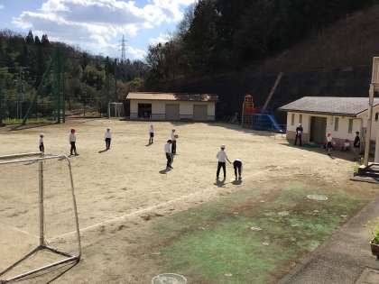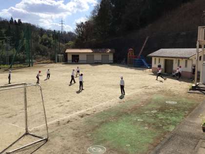 3年生と4年生は運動場でキックベースボールをしていました。