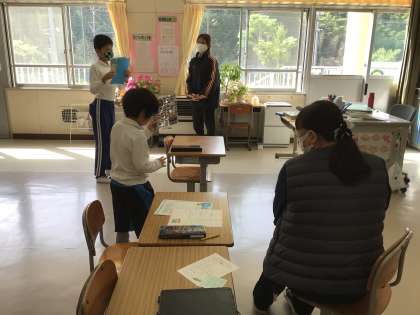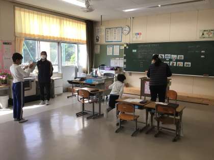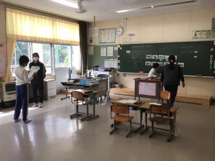 さちのみ、むくのきでは、カードや写真を使って、自己紹介の練習をしていました。子供たちの興味を高められるように黒板に何枚もの写真が貼ってあり、担任の一人一人に応じた準備や工夫、願いがうれしい授業でした。2年生の児童も理解した途端に黒板に駆け寄っていきました。