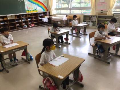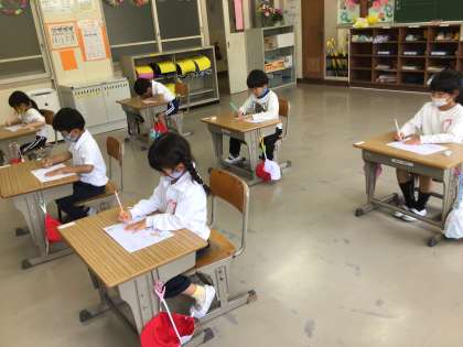 1年生の教室を覗くと、今度は国語の学習をしていました。とても丁寧な字でひらがなを書いていました。先生が「さっき手の運動をやったから上手な字が書けるかな」と声をかけると、途端にさらに姿勢よく書き始める子供たちでした。やる気があってとてもいいです。