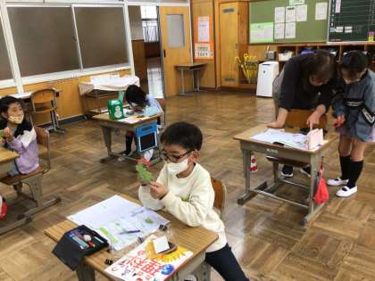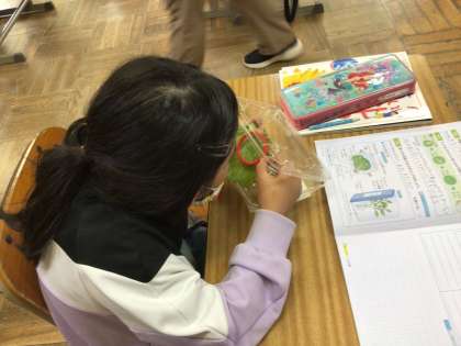 3年生の理科の時間では、子供たちが無心に虫眼鏡を覗いています。葉っぱに何か付いているようです。尋ねてみると、モンシロチョウの卵だそうです。小さな薄黄色い卵がびっしりと葉っぱについていました。よく見つけたね。身の回りの自然には不思議がいっぱい、発見があるね。