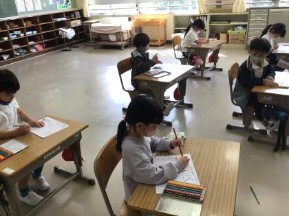 1年生の教室では、ひらがなの練習をしていました。ひらがなを練習し終えると、ていねいに色塗りをしていました。覚えたひらがなの挿絵がありました。