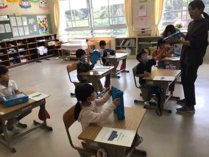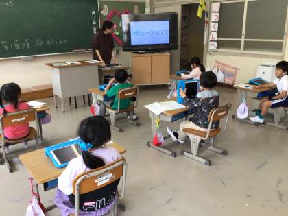 一年生ははじめての学習タブレットの体験をしました。最初にタブレットを立ち上げるための練習をしました。子供たちは1人で立ち上げることができてとてもうれしそうです。