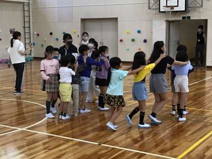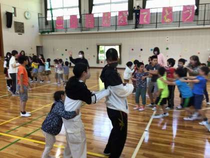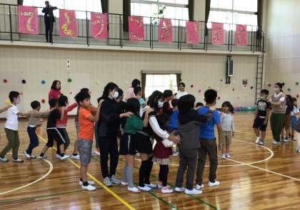 全校で行う遊びは「じゃんけん列車」です。一列になって歩いていると、人と人との距離がぐっと近づき、とても仲良くなったような感じがしてきます。「じゃんけんポン」の大きな声と歓声が、体育館に響いていました。