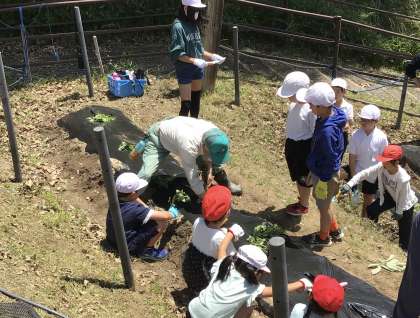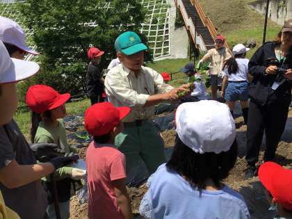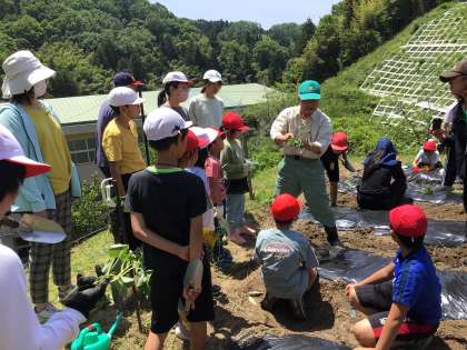 地域講師の藤嶋さんがそれぞれの班を回って、斜めに挿す植え方を教えてくださいました。みんな真剣に聞いています。立派なお芋を作るために頑張らないとね。