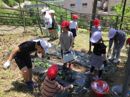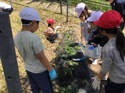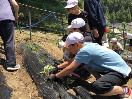 わくファミ班のみんなで声を掛け合って、協力した芋の苗植え。みるみるうちに芋畑ができました。