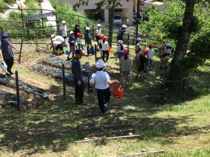 今回も畑の周りを構内整備員の柘植さん椙本さんがあらかじめ刈り取ってくれていました。みんなが子供たちのためにと、環境を整えてくれた芋の苗植えでした。子供たちのありがとうございますという元気な明るい声で、思わず笑顔になりました。美味しいお芋ができますよ、きっと。