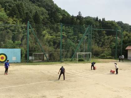 明日の体力テストに向けて子供たちの下校後、先生たちで汗だくになりながら運動場のライン引きをしました。実力が発揮できるといいですが、今、強い雨が降ってきました。水曜日に延期かな。ライン引き直しになります。残念。