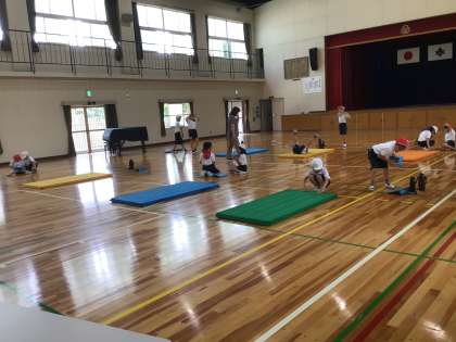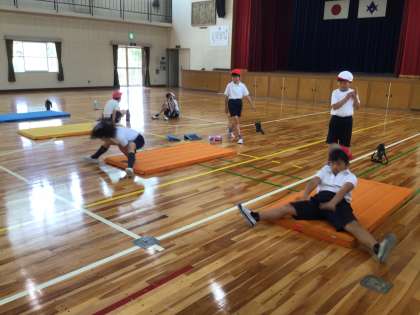3年生4年生は体育館でマット運動をしました。子供たちの手には学習タブレット。友達の動きをタブレットで撮影し振り返りながらよりよい動きを目指します。みるみるうちに足がピンと伸び、かっこよい回転ができるようになりました。