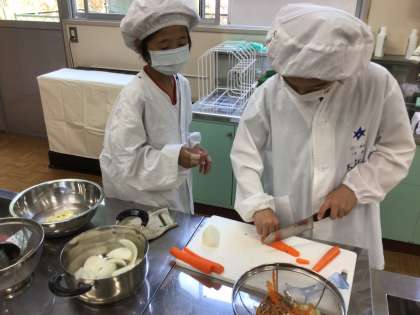 ご飯を飯ごうで炊き、野菜を切ってカレーを調理しました。口々にこんなにおいしいご飯は初めてだ。ご飯嫌いでもご飯が好きになる。カレーがすごくおいしい。と大満足の子供たち。給食もいつも通り食べることができて、びっくりしました。