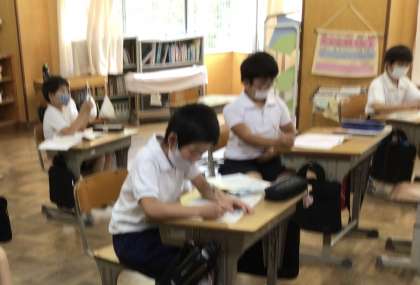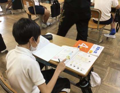 4年生の子供たちは算数の時間にプリントや算数の友を使って復習に取り組みました。やっと問題が解けて先生から花丸をもらった子は、「やった!」とうれしそうでした。自分の力で解けるようになるってうれしいね。