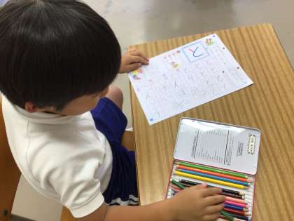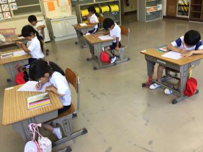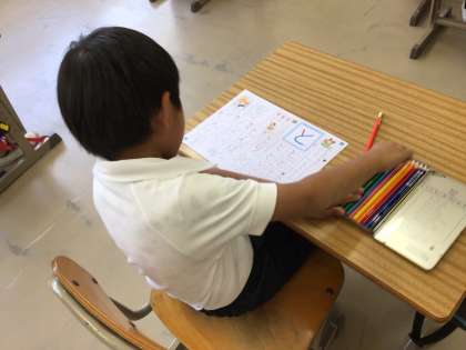一年生の国語では、毎日ひらがなを一文字ずつ学んでいます。今日は「と」でした。丁寧にお手本をなぞり、形よく書きます。丸をもらえた人は、との字がつく言葉の絵を色塗りします。色塗りしながら言葉を獲得していきます。