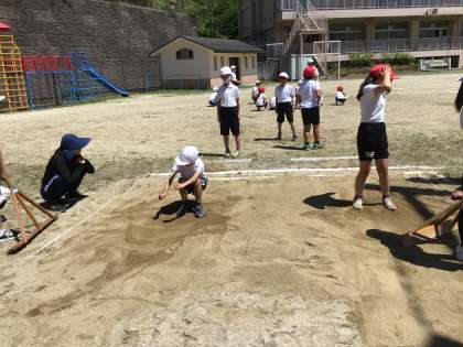 砂場は事前に公務手さんが耕運機で耕してくれていました。4年生が跳ぶと6年生の子が砂場を平らにしてくれました。とても手早い作業でした。ありがとう。
