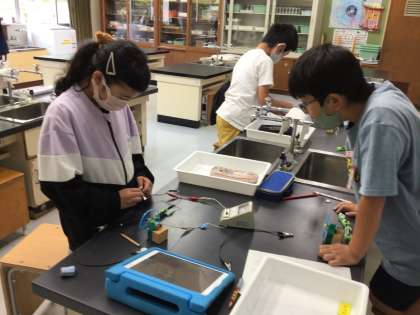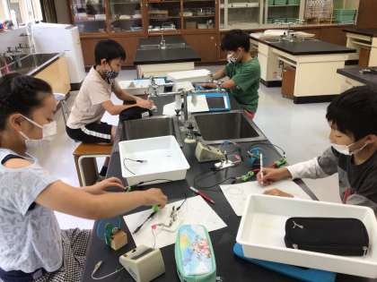 4年生の理科では直列つなぎと並列つなぎを比べ、豆電球の明るさを確認しました。グループでお互いにクイズを出して回路図を書いたり、スイッチや豆電球、簡易検流計、モーターの記号を使って回路図を書いたりしました。もう回路は簡単に作ることができますね。
