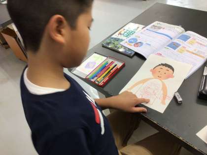 案外自分の体についてはよくわからないものなので、担当の先生のアイディアで一人ひとりに体の中を想像してもらいました。お互いのシートを見ながら、さらに関心を高めた子供たちでした。