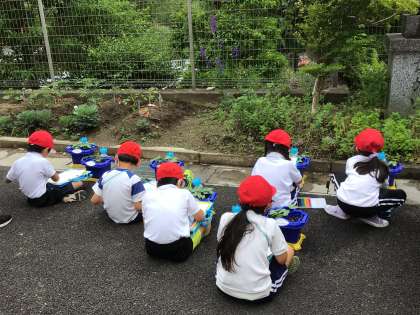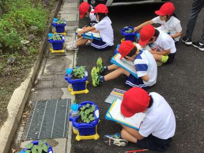 朝顔の観察に一生懸命な様子の子供たちでした。ちょうど双葉からかわいい本葉が顔を出してたところを観察記録に書いていました。手触りをつるつるとかふわふわと表現したり、色の違いを色を塗って表したりと、対話をしながらよく見て書くことができていました。
