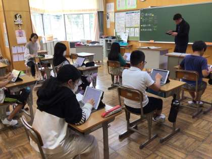 学習用タブレットのスタディノートで先生が課題を配付すると、子供たちは勢いよく取り組み始めました。友達の考えと比較して、自分の考えのポイントをみんなに紹介することに意欲的な子供たちでした。