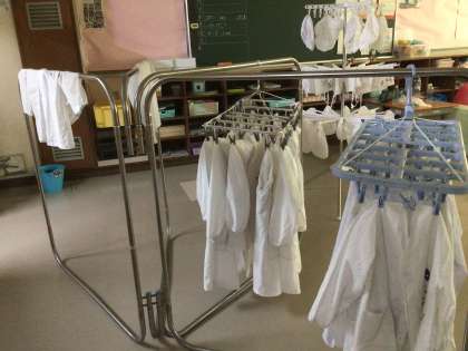 給食担当の先生が全校の当番の服を集め、洗濯をしてくれました。助かります。ありがとうございました。来週は新しい当番がきれいな服装で活動ができます。