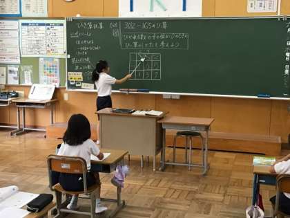 計算の仕方を説明する時には、理由も付け加えながら詳しく友達に説明していました。さらに、次の子は、前の子の説明を参考にしながら、同じ部分を自分の言葉で説明していました。友達の説明を聞くことで自信をもって、みんなが筆算の仕方を説明できるようになっていました。