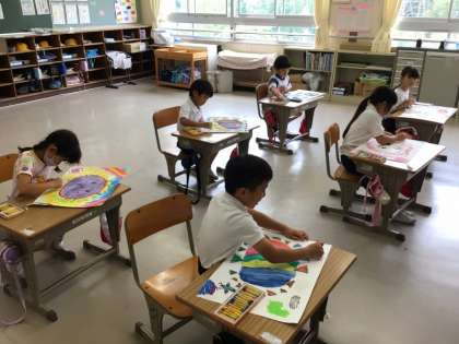 1年生は、画用紙に大きくにこにこしたおひさまをかきました。クレヨンで、しっかりと色鮮やかに色を塗って、おひさまがとてもうれしそうに、にこにこしているように見えます。