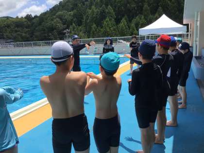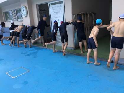5、6年生の子供たちはバタ足のイメージをつかむために、壁を使って練習をしていました。